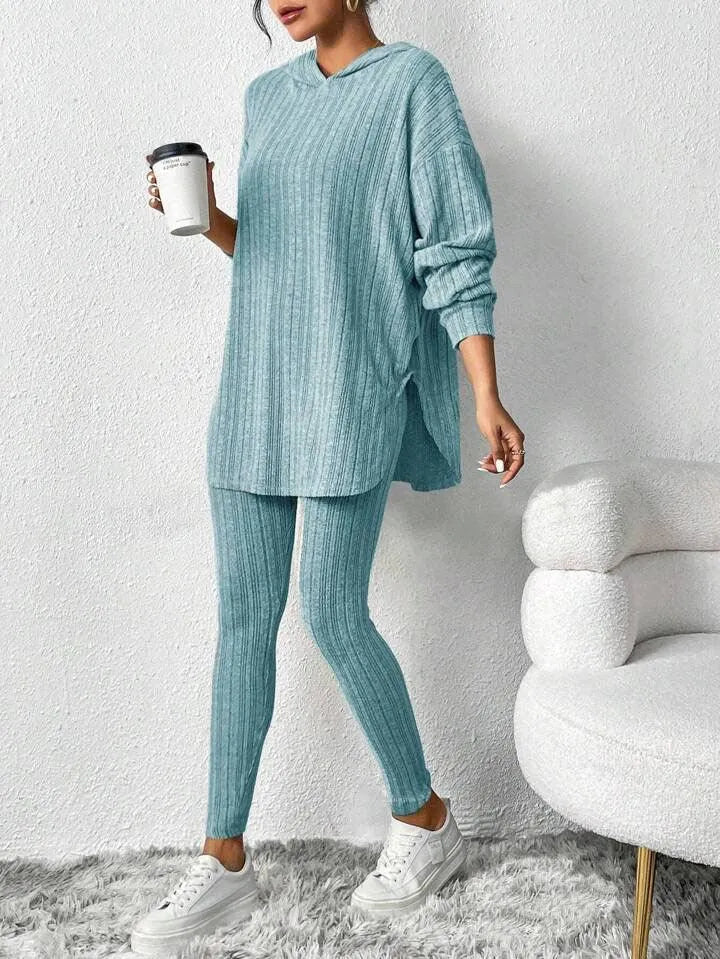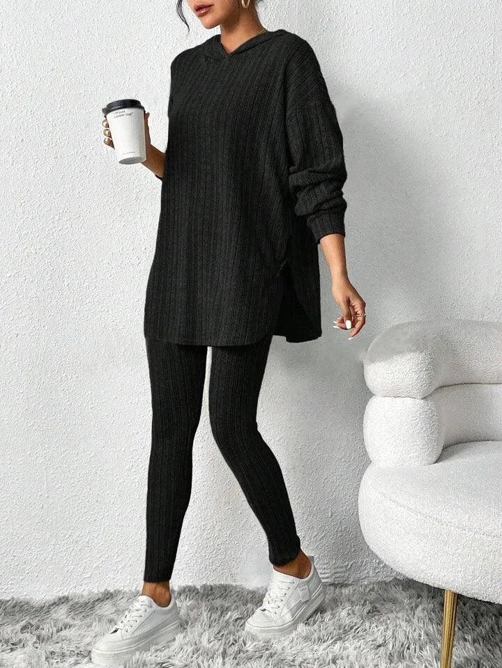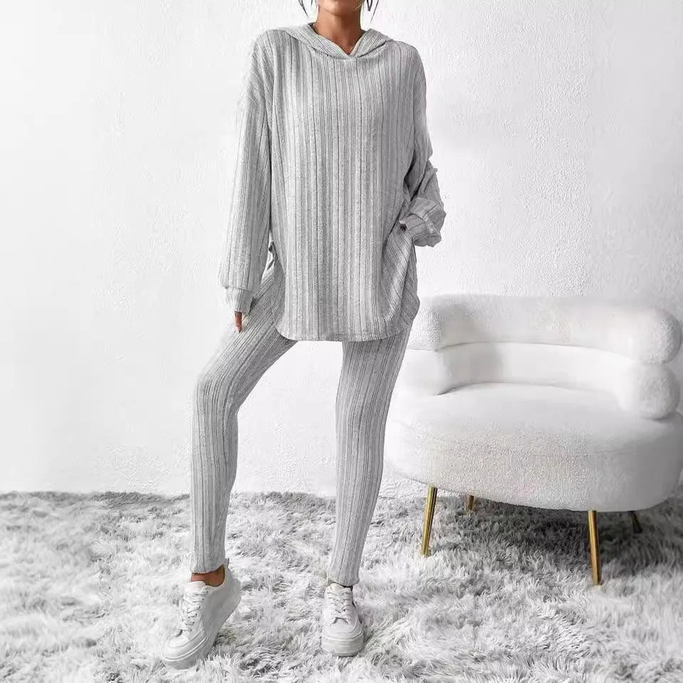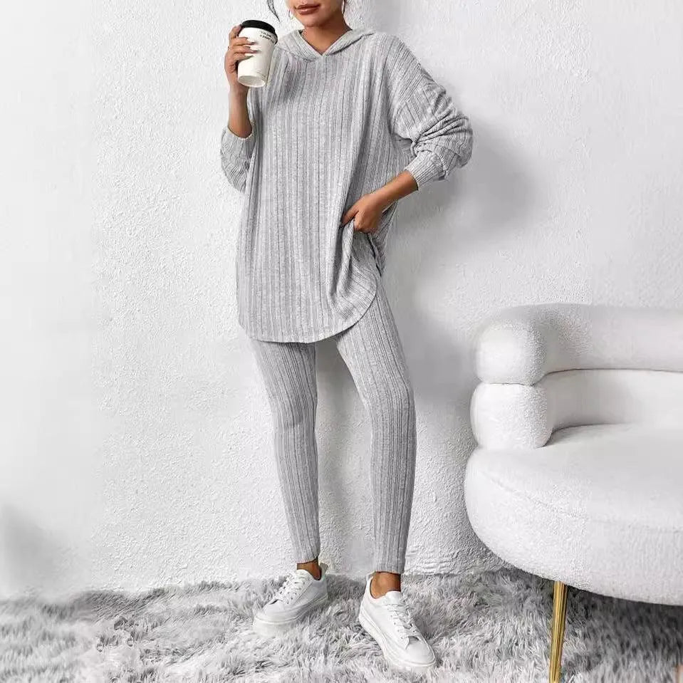 WW | Damen Langarmset mit weit geschnittenem Kapuzenoberteil in einfarbigem Streifen
