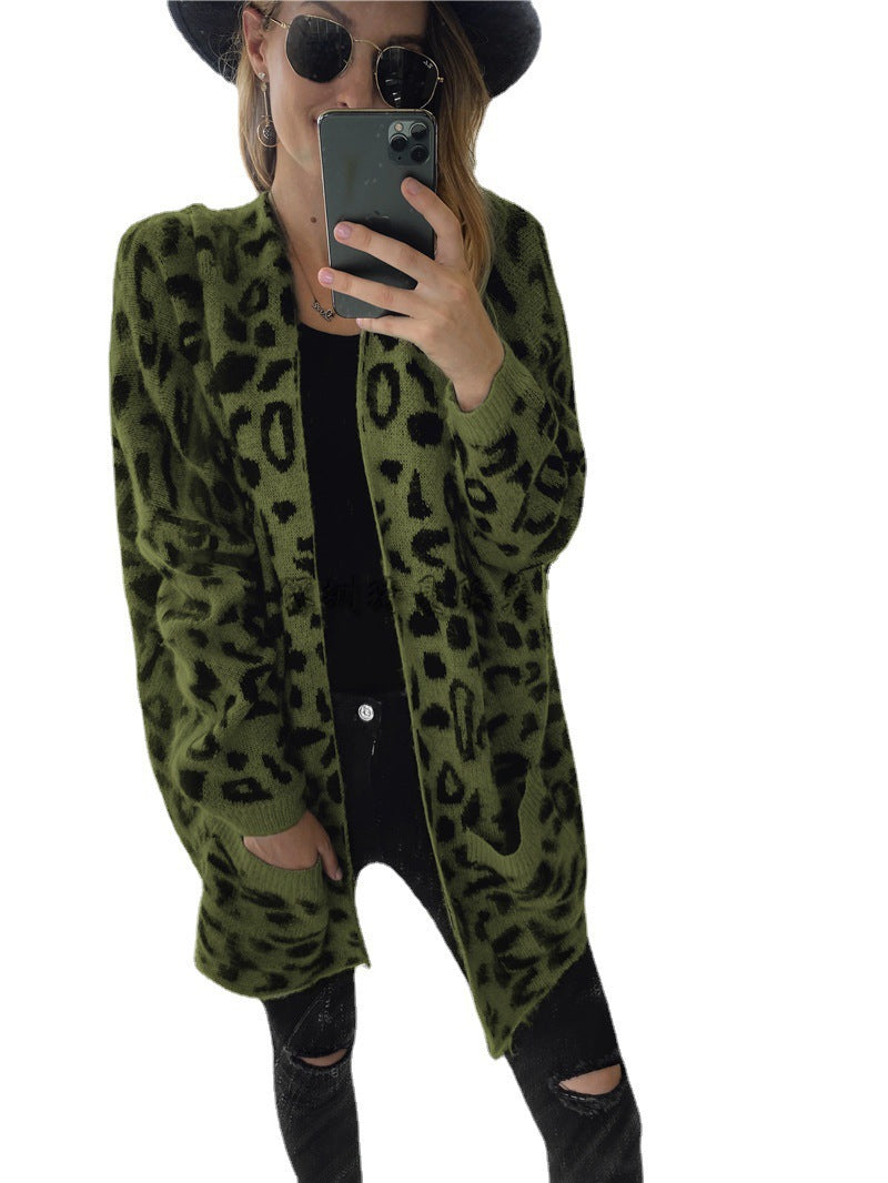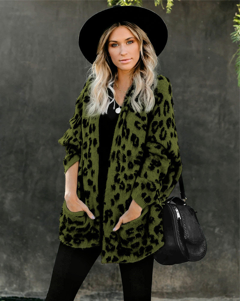Damen lässiger Strickmantel im Leopardenmuster mit bequemem Schnitt und Taschen WW